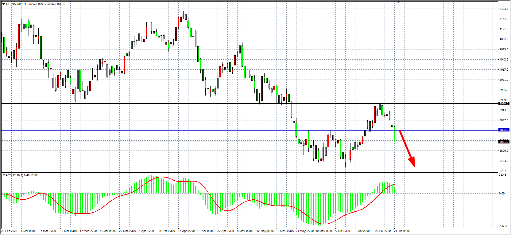 4小时图看,沪深300进一步跌破3860,MACD量能在零轴上有所缩量,趋势偏空头,3860已转化为压力,该位之下继续看跌3780-3700附近。
