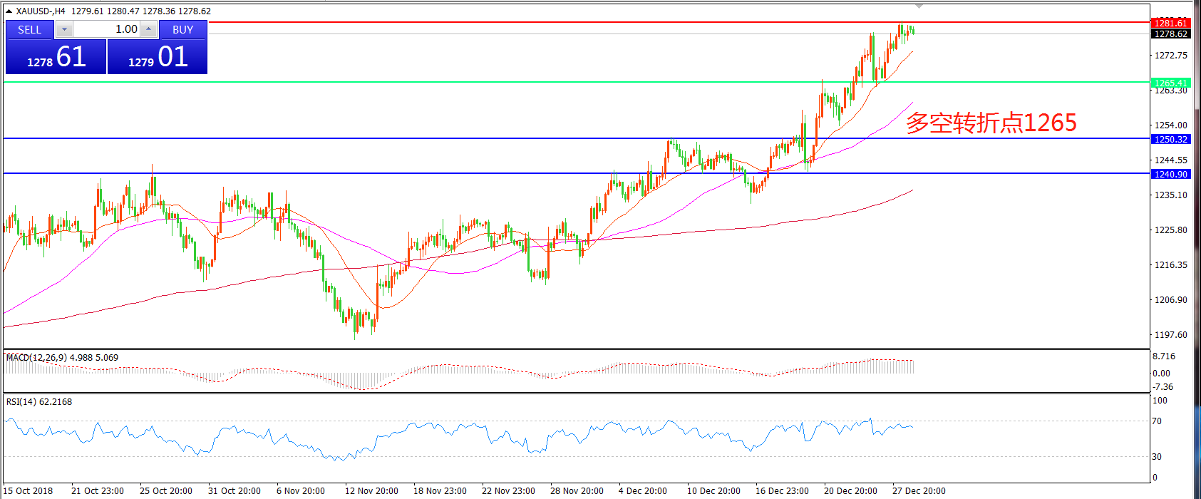 在特朗普的强硬态度下,美国政府关门将持续至2019年1月份,1月3日民主党将重新接管众议院,这将使得特朗普通过边境墙面临更大的困难,从而引发更大的政治不确定性。在避险情绪的推升下,黄金受避险支撑不断走高并触及1280美元。本周市场将迎来备受关注的美国非农就业报告,预计将引发下周金市的行情