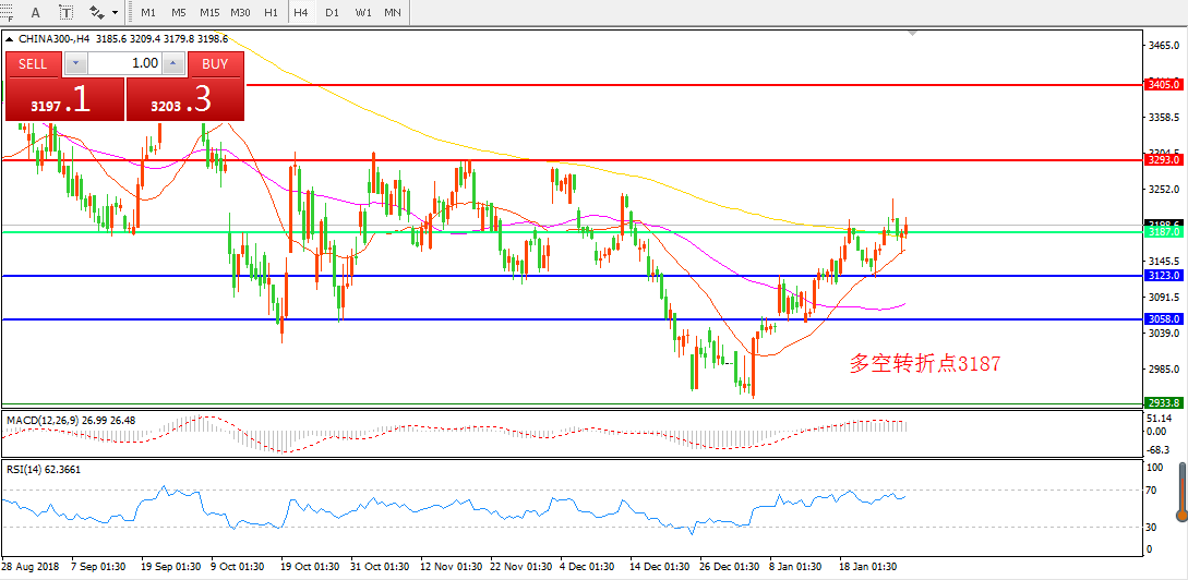 4小时图看,CHINA300中华指数经过连续整理突破并站稳200周期均线,整体价位依然在多空转折点之上。短期均线逐渐拐头, MACD红柱减少,暂时仍保持偏多思路。