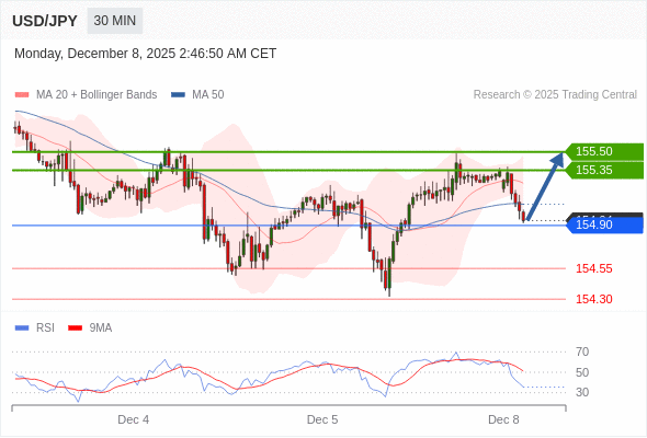 在 154.90 之上,看涨,目标价位为 155.35 ,然后为 155.50 。