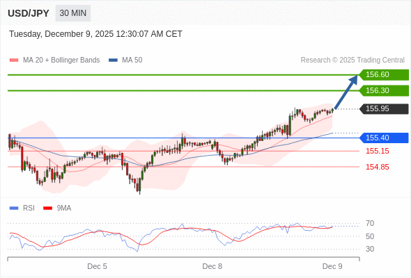 在 155.40 之上,看涨,目标价位为 156.30 ,然后为 156.60 。
