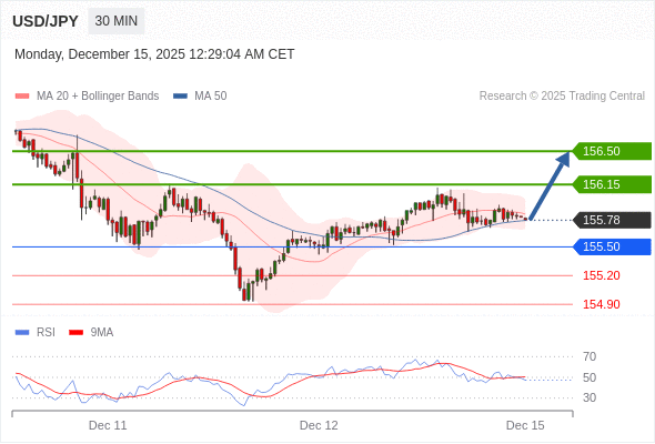 在 155.50 之上,看涨,目标价位为 156.15 ,然后为 156.50 。