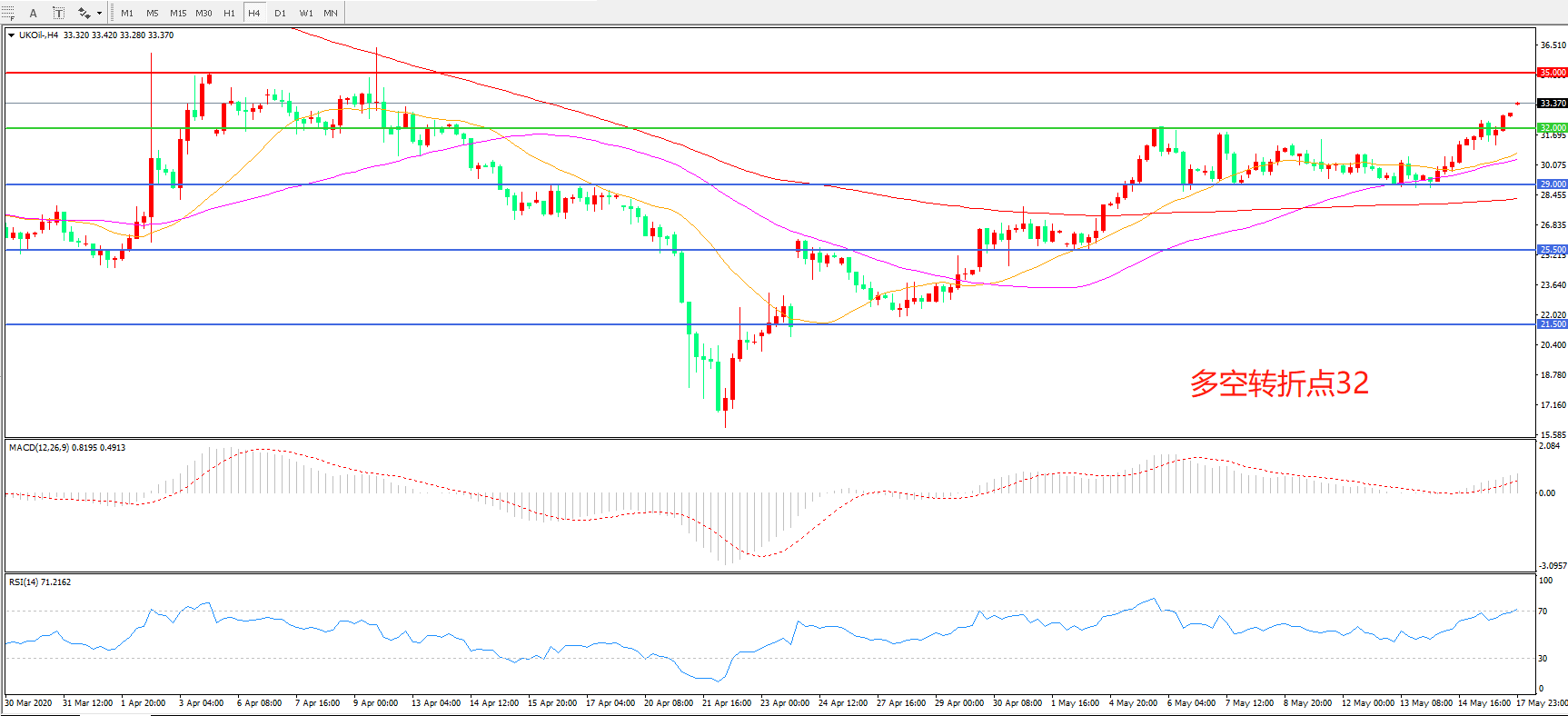 4小时图看,油价震荡走高,突破区间整理上沿,整体走势偏多,均线系统拐头向上,MACD红柱增加,RSI指标向上,日内震荡上行概率较大。