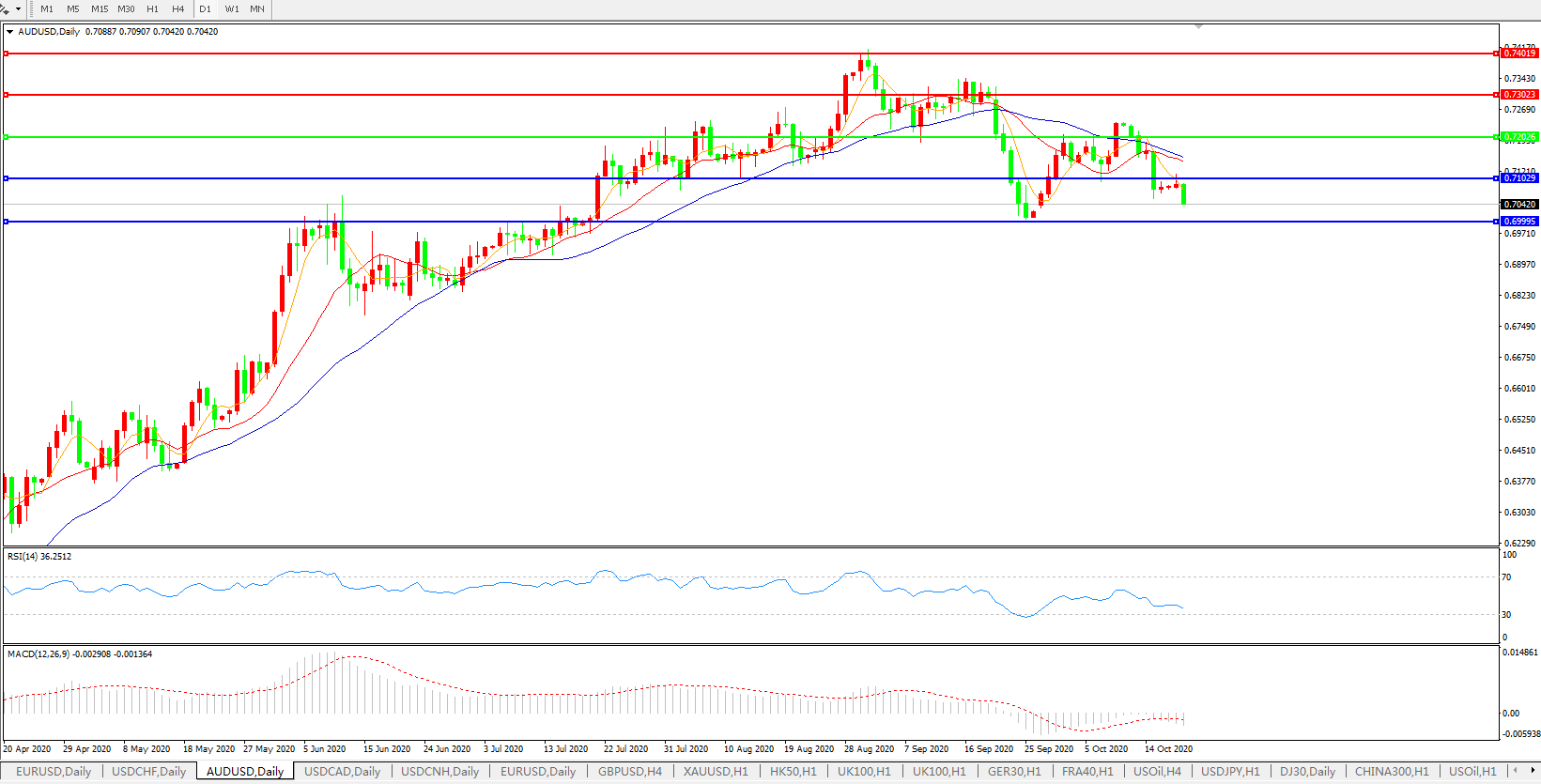 澳元兑美元跌0.10%,报0.7074美元;纽元兑美元涨0.06%至0.6606;早些时候突破了在0.6632的55日移动均线,达到当日高点0.6646,市场仍在消化总理Jacinda Ardern的历史性胜利。早些时候,中国的经济数据增强了积极的风险偏好;中国9月份工业产值和零售额超过经济学家的预期,不过第三季度经济增长低于预期。