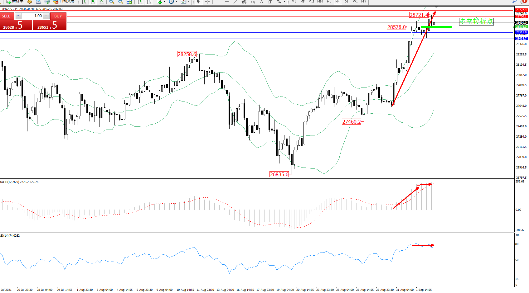 技术点评:多头动力延续布林带指标上轨附近持续震荡上扬,高位抵达28721附近开始短暂震荡,布林带指标呈上行趋势走势拉升中,呈收口不断向上移动中,短期或维持向上移动态势,MACD指标处于多头区域持续震荡上扬后开始平移,RSI指标纠结于80均衡线下侧弱势整理平移;
