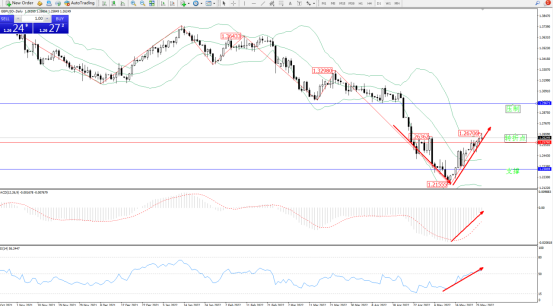 空头力度延续布林带指标通道中下轨区间持续震荡下行,低位抵达1.21555附近节点后开始反转呈V型走势不断上移,触及布林带指标上轨至1.26706附近节点整理,短期多头动力有继续向上拉升态势,布林带指标呈收口走势后开始平移,上方压制关注1.29673附近节点,低位支撑关注1.23059附近,关注1.25760附近转折点,MACD指标处于空头区域维持震荡上移至0轴线附近徘徊,RSI指标多头动力拉升上移至50均衡线上侧徘徊中,如图: