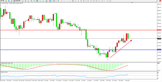 市场看涨情绪笼罩,金价低位持续震荡拉升,短期多头有继续攀升态势,上方压制关注1807附近,低位支撑关注1725附近,MACD指标处于空头区域维持震荡上移至0轴线上侧徘徊,RSI指标处于50均衡线上侧窄幅整理。
