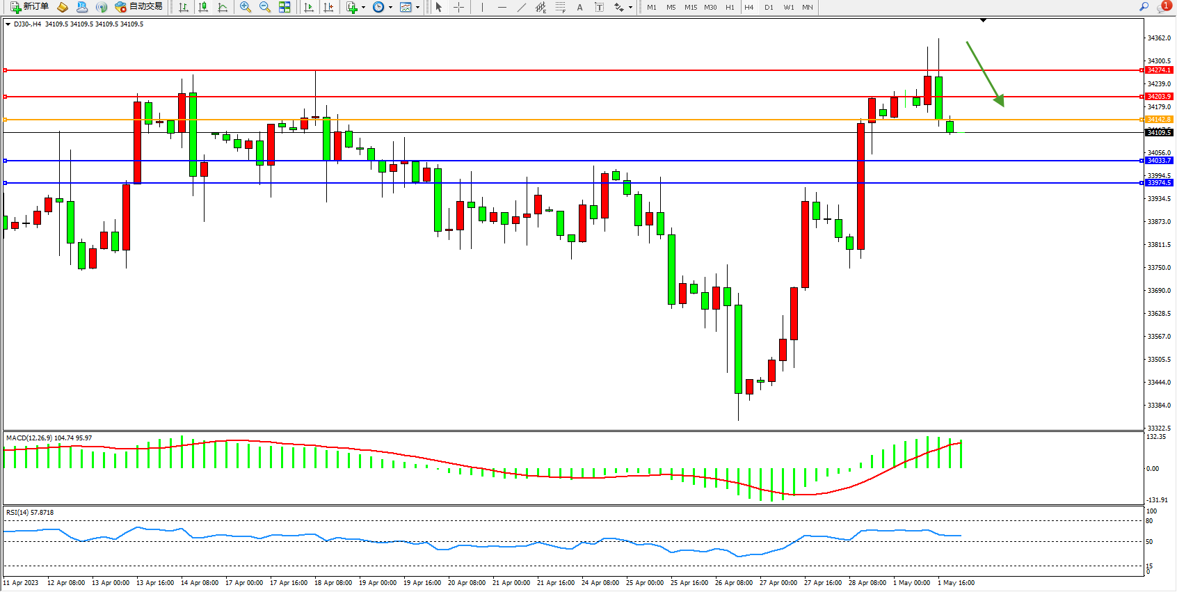 道琼斯指数5月1日(周一)收盘下跌47.25点,跌幅0.14%,报34050.91点;美国联邦公开市场委员会(FOMC)将于5月2-3日召开会议,投资者普遍预计美联储别无选择,将继续加息25个基点至5.00%-5.25%。